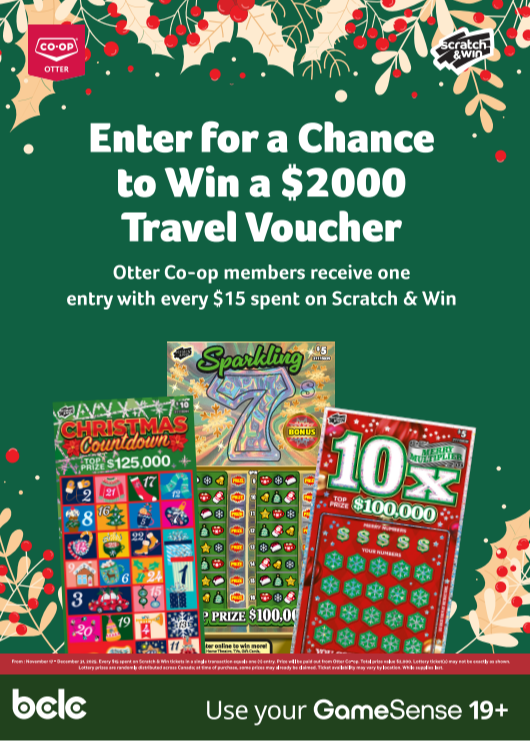 The weather outside might be frightful, but Otter Co-op and BCLC have you covered! Right now, you can enter for a chance to win a $2000 Travel Voucher with every $15 of Scratch and Win purchased at Otter Food Stores and Gas Bars as part of Otter's Plus Program!